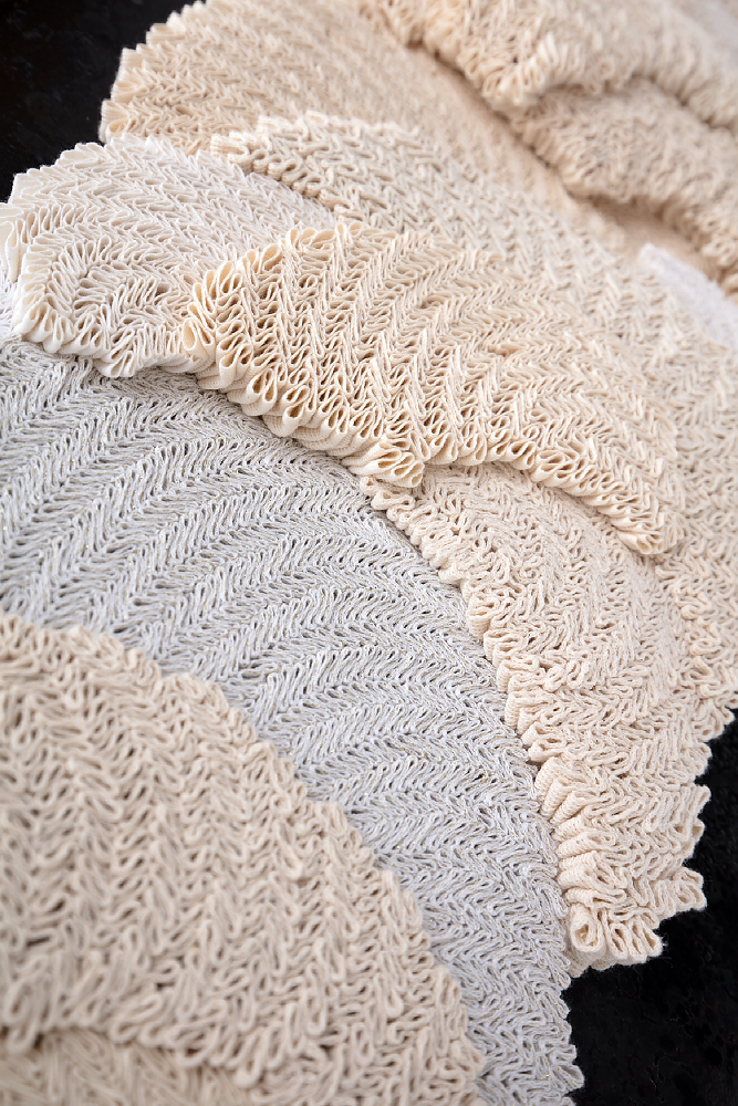 « Le textile est un matériau que la vie a constamment mis sur mon chemin. Toute petite, je brodais sur du carton. Je regardais ma mère et ma sœur broder, coudre … De cette nourriture familiale est certainement née ma curiosité textile et manuelle que je n’ai cessé d’explorer par la suite.